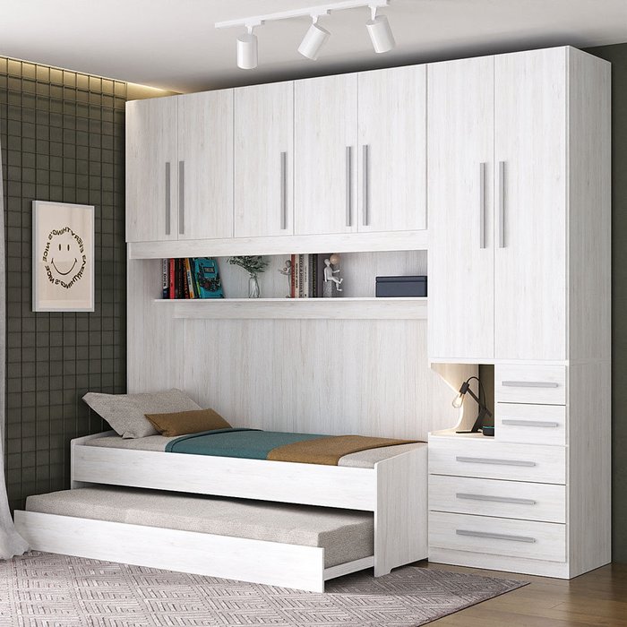| Itens Inclusos | 01 Guarda-roupas de 2 portas e 5 gavetas com mesa de cabeceira embutida modelo 1224; 01 Maleiro 5 portas modelo 1326; 01 Cama turca de solteiro para colchão 88x188 cm modelo 1329; 01 cama auxiliar modelo 1250; kit de ferragens. |