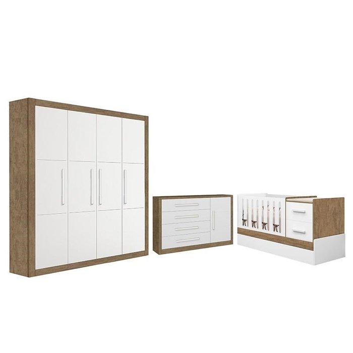 Dormitório Infantil Affetto New com Guarda Roupa, Cômoda e Berço Premium Amêndoa/Branco Acetinado -