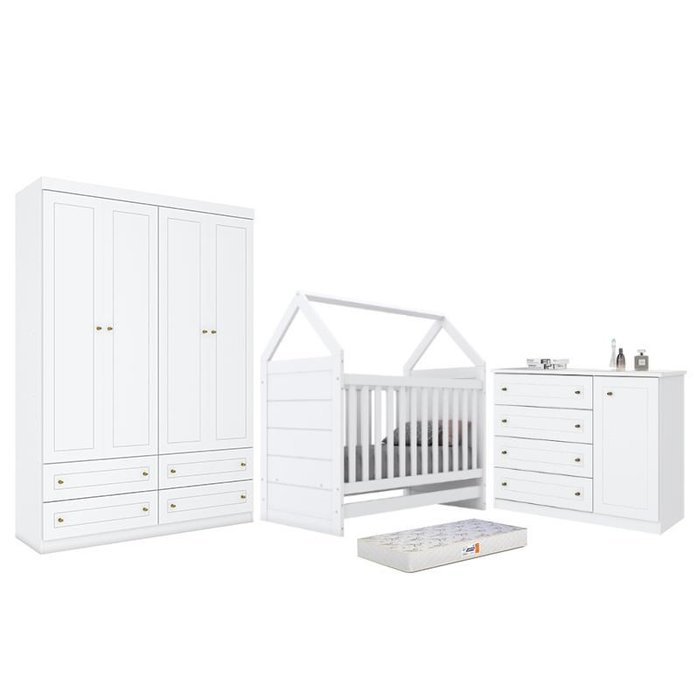 Dormitório Infantil Mississipi 4 Portas, Cômoda, Berço Cabana Branco com Colchão - Móveis Henn