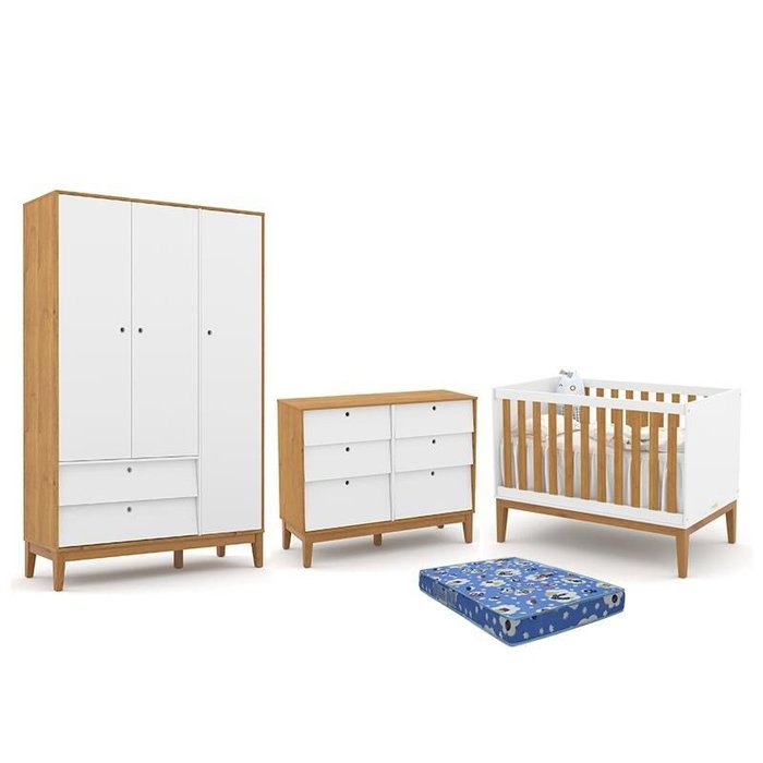 Dormitório Infantil Unique 3 Portas, Cômoda 6 Gavetas, Berço Branco Soft/Freijó/Eco Wood com Colchão