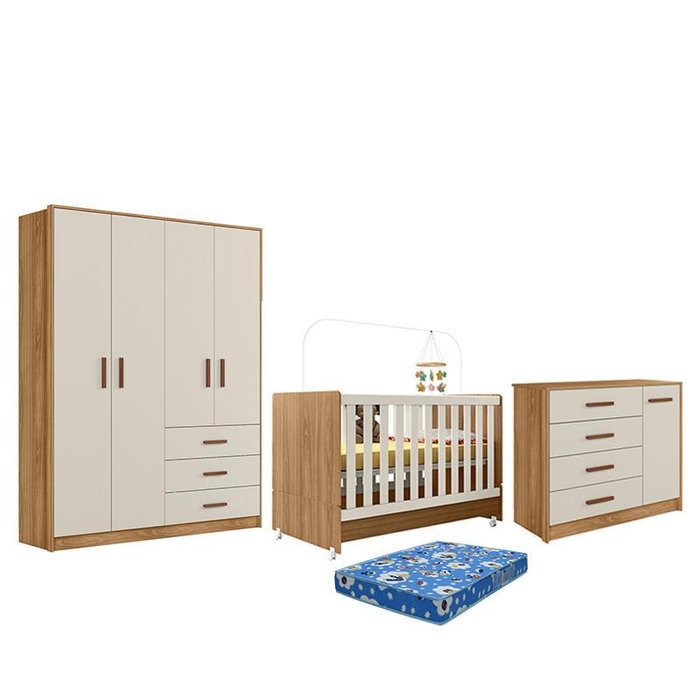 Dormitório Pérola Guarda Roupa, Cômoda e Berço Nature/off White com Colchão Physical -