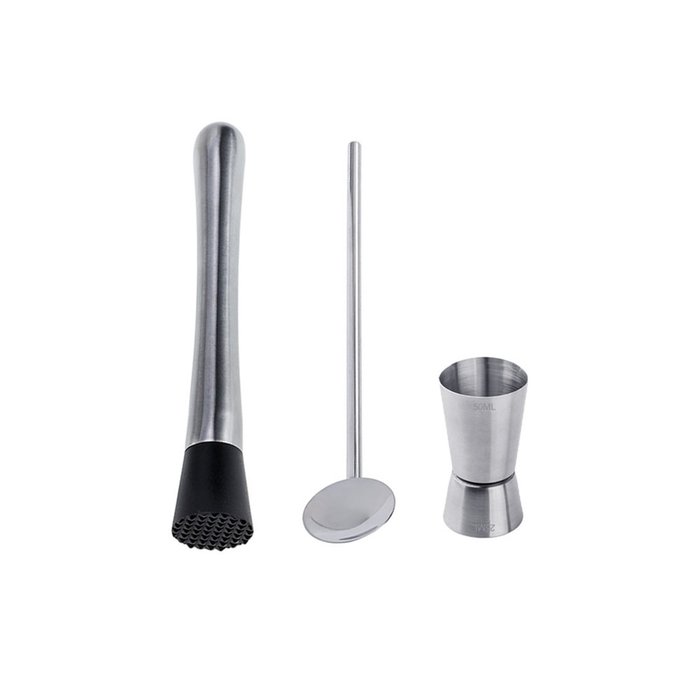 Kit para drinks com socador de frutas, colher canudo e dosador duplo. O kit são acessórios essenciais para preparar aquele drink perfeito. Acessórios para elaborar desde drinks simples até os mais sofisticados coquetéis. O socador foi produzido especialmente para macerar com facilidade uma grande variedade de frutas utilizadas em drinks, este socador é considerado um grande aliado no preparo das mais diversas receitas como: caipirinha, caipiroska ou até mesmo mojito. Sua base de contato tritura facilmente a fruta diretamente no copo sem danificá-lo, enquanto o formato ergonômico e confortável proporciona muito mais segurança durante o manuseio.