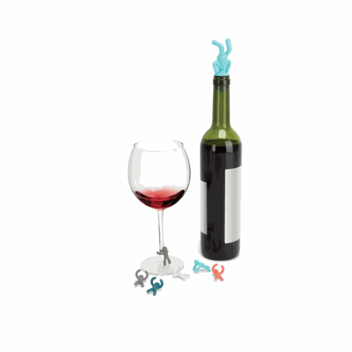 Puro charme esse conjunto para vinho! Seus amigos não vão deixar de comentar! Os marca taças vão te ajudar a nunca mais confundir sua taça com das outras pessoas e a tampa para garrafa traz humor para uma hora do vinho mais descontraída, além de proteger sua bebida. Segue na embalagem: 1 tampa de garrafa - Drinking Buddy 6 Identificadores de taça - Little Buddys!