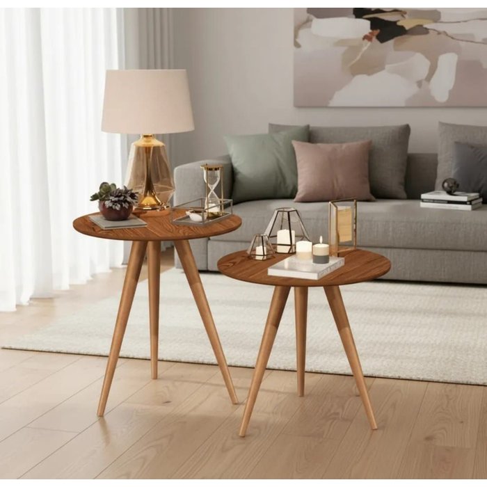 Duas Mesinhas Apoio e Lateral Redondas Pés Palito Freijó