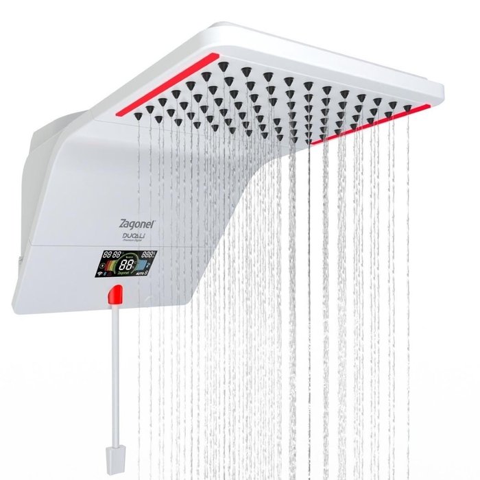 A Ducha Eletrônica Ducali Premium Digital Zagonel alia design moderno e tecnologia inteligente para oferecer muito mais que um banho comum. Com 5500w de potência e conexão Wi-Fi e Bluetooth, você tem controle total da temperatura, jato e funcionalidades pelo aplicativo exclusivo Smart Banho, garantindo praticidade para cada usuário da sua casa. Perfeita para quem busca conforto, segurança e economia, essa ducha traz o inovador Sistema Híbrido Smart, compatível com aquecimento solar, a gás ou elétrico, além de funcionar de forma individual. - Controle Digital Inteligente: ajuste de temperatura progressiva e perfis de banho.- Aplicativo Smart Banho: conexão Wi-Fi e Bluetooth para gerenciar funções direto do celular.- Quatro Perfis de Banho: ideal para famílias, cada membro com sua configuração preferida.- Controle Parental: mais segurança para crianças e idosos.- Banho Eco e Seguro: economia de água e energia sem abrir mão do conforto.- LED RGB e Display de Cristal Líquido: design sofisticado e visual moderno.- Acionamento com baixa pressão d?água: ideal mesmo para residências com pouca pressão hidráulica. Especificações Técnicas:- Modelo: Ducali Premium Digital 7500w 220V (DDPEL75220BR03)- Potência: 7500w- Tensão: 220V- Pressão mínima: 1 m.c.a.- Espalhador: 210 x 130mm- Cor: Branco- Garantia: 12 meses (3 meses para resistência)- Composição: termoplásticos de alta qualidade- Sistema de proteção contra choque elétrico Características- Marca: Zagonel- Dimensões do produto: CxLxA (cm) 47,6cm x 23,7cm x 26,5cm- Peso do produto (kg): 2 kg- Conteúdo da embalagem: 01 Ducha Eletrônica Ducali Premium Digital 7500w 220V DDPEL75220BR03 Branco Zagonel Garanta já a sua Ducha Eletrônica Ducali Premium Digital e eleve o nível do seu banho para um padrão de conforto e inovação!