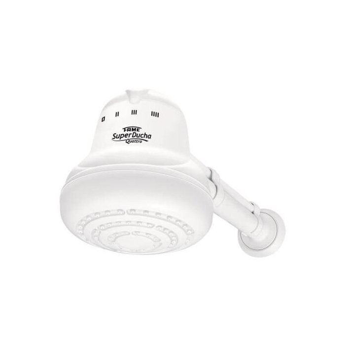A Super Ducha Quattro já vem com Cano. É a opção ideal para quem necessita de uma instalação completa, padronizada e melhor custo benefício. Além disso segue também chuveirinho manual, com suporte/bucha e parafuso de fixação. Super Ducha Quattro: Seletor de temperaturas com exclusiva isolação: Maior segurança. Maior rapidez e facilidade na troca da Resistência, com exclusivo sistema de encaixe, que garante perfeito contato elétrico. Baixa corrente de Fuga: Compatível com dispositovo DR. Diafragma de última geração: maior precisão no acionamento com durabilidade ainda maior. Conjunto de contatos elétricos super reforçados garantindo mais segurança. Crivo exclusivo: jato de água mais amplo, proporcionando maior conforto e prazer. Remoção e recolocação com maior facilidade, proporcionando a limpeza do crivo ainda mais fácil. Cano FAME: 30cm de comprimento com rosca padrão de ½ tipo gás. Super Ducha Quattro com Cano, um produto completo em instalação e qualidade. Especificações Técnicas: Tensão (Volts): 127V~ Resistência Código: 1789 Potência Nominal (Watts) posição 4 - Super Quente: 5.400W Potência Intermediária (Watts) posição 3 - Quente: 3.200W Potência Econômica (Watts) posição 2 - Morna: 2.200W Seção Mínima do condutor (mm²): 10,0 Disjuntor (Ampères): 50A Distância máxima do quadro de distribuição (metros): 26m