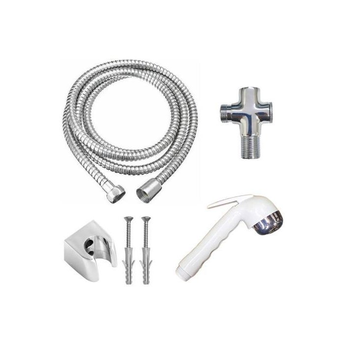 A ducha é composta por uma mangueira de aproximadamente 1,10m, uma ducha gatilho branca e cromada, um te 1/2 com 2 saídas, um suporte em PVC, parafusos e buchas. Todos os itens necessários para a instalação estão inclusos.