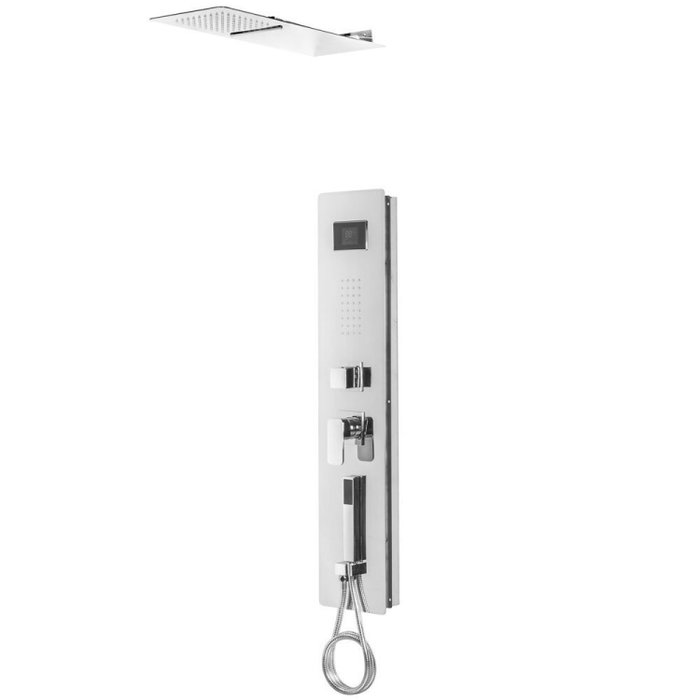 A Ducha Vertical de Embutir com Hidro e Cascata (Inox Cromada) com acabamento espelhado, é perfeita para quem busca uma ducha sofisticada e contemporânea. Possui em seu corpo um painel de LCD, acionado através da energia gerada pela passagem da água, que mostra a temperatura d'água e o tempo de banho. Possui um jato de hidromassagem que garante o prazer de um banho revigorante ideal para relaxar e tirar o stress do dia-a-dia, graças à pressão da água que proporciona uma leve massagem durante o banho, também possui uma saída de água em formato cascata que se assemelha a uma queda d'água.