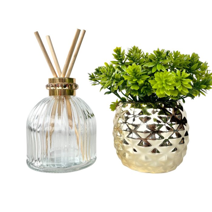 Dupla vaso dourado de cerâmica e difusor de vidro trabalhado