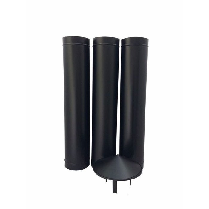 Duto preto com chapéu chinês para chaminés. Diâmetro: 150 mm. Altura dos dutos: 3 peças de 60 cm. cada que encaixam entre si. Chapéu chinês preto com 3 hastes para fixação com rebites. Rebites não acompanham o produto.