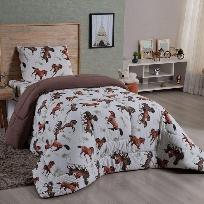 Edredom Fantasy Solteiro 01 Peça Infantil Tecido Malha 100% Algodão Macio Dupla Face - Cavalo Marrom