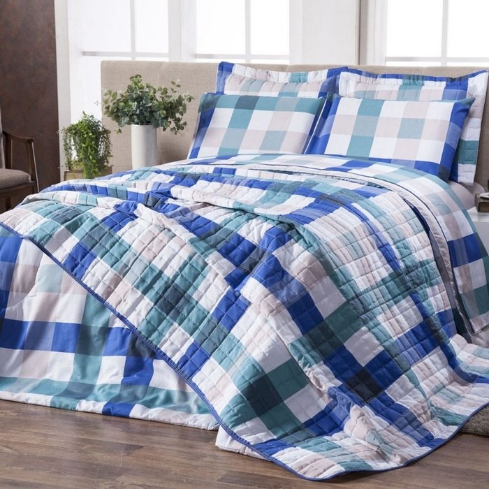 Edredom Queen 3 peças Algodão Percal 160 Fios Classic:Xadrez Acqua Xadrez Acqua