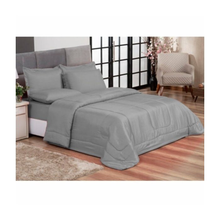 Edredom Queen Cinza + Jogo de Lençol 06 peças Aconchego Dupla Face Casa Dona Cinza