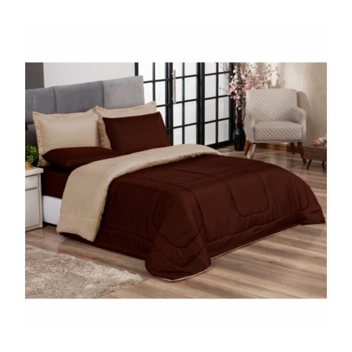 Edredom Queen Marrom e Bege + Jogo de Lençol 06 peças Aconchego Dupla Face Casa Dona