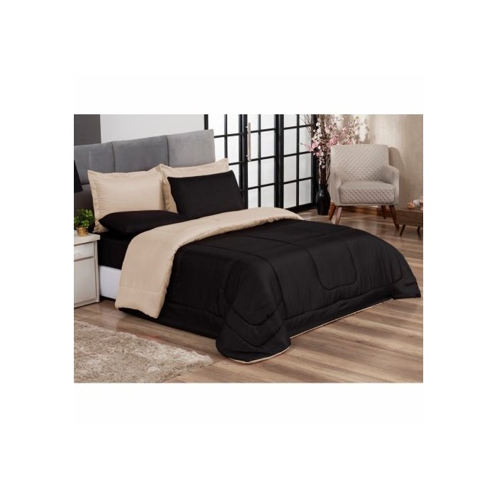 Edredom Queen Preto com Bege + Jogo de Lençol 06 peças Aconchego Dupla Face Casa Dona