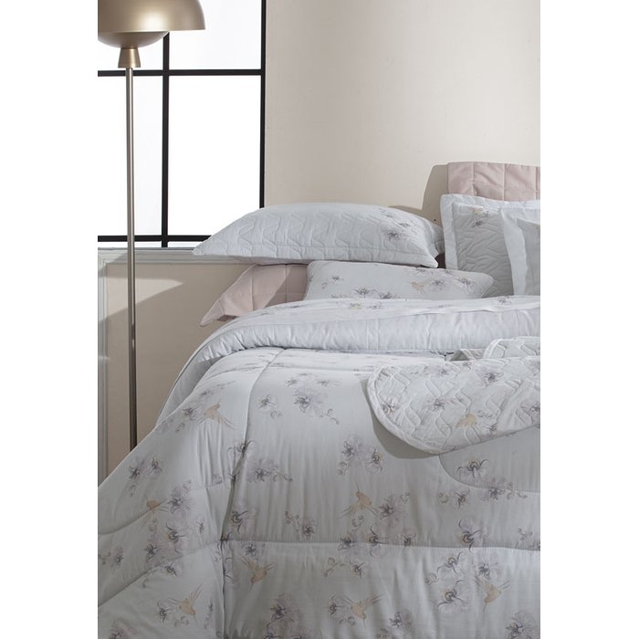 Concebida em percal puro algodão o que garante um toque acetinado. Uma gama harmoniosa de desenhos coordenados entre estampa principal, composê e estampa localizada na fronha.