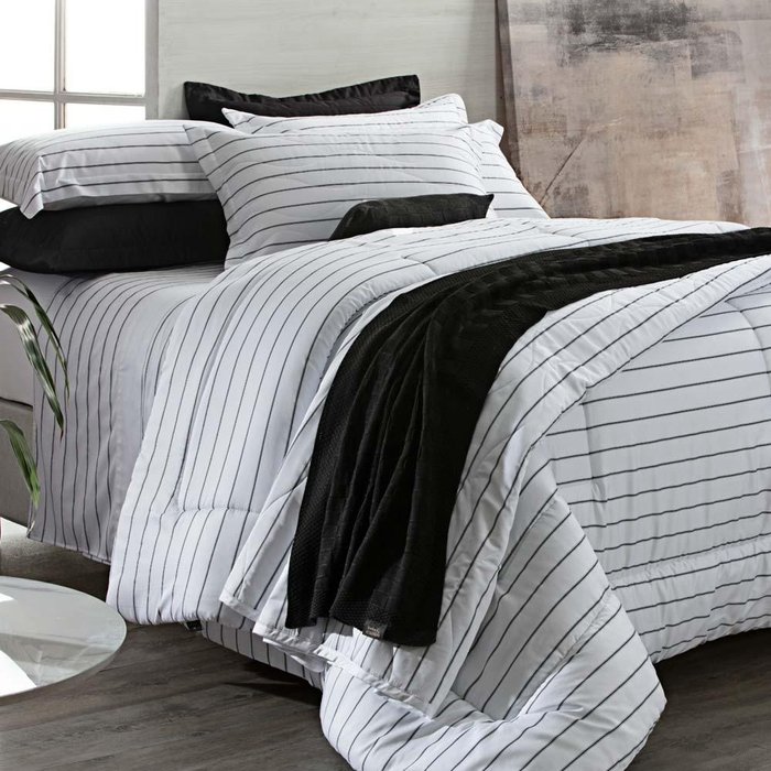 Os edredons da linha Satinée Kacyumara são confeccionados sobre a base exuberante do tecido de algodão egípcio naturalmente hipoalergênico, percal 300 fios com tratamento especial que confere um toque de seda e conta ainda com propriedade anti-pilling evitando que o tecido forme bolinhas e enchimento 100% poliéster com gramatura de 180g/m². A elegante estampa Triest eleva a estética minimalista apresentando listras finas em preto e cinza, cuidadosamente espaçadas sobre um fundo branco, criando uma sensação de simplicidade e sofisticação. Os edredons estampados da linha são pantográfico dupla face com estampa coordenada com jogo de cama. Perfeito para aquecer sua cama! Foto meramente ilustrativa. Contém: