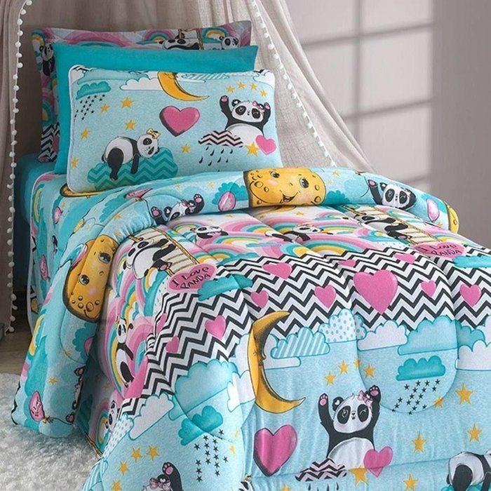 Edredom Solteiro Liverpool Kids Dupla Face Malha Estampada 4 Peças - Love Panda