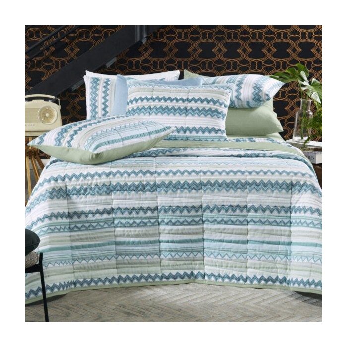 O chevrom texturizado dá um toque de modernidade as listras aquareladas na estampa Vértices. A cartela de cores apresenta tons frescos e atuais, como o verde e o azul, que formam uma bela e elegante composição para a decoração da cama.