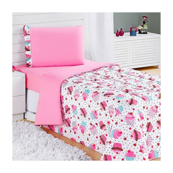 Edredom Solteiro Menina rosa Cupcake Estampado 2,10m x 1,40m