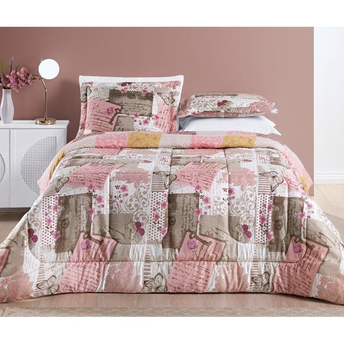 Edredom Super King 3 peças Dupla face Inverno Quente Bouti Estampado:Patchwork Rosa