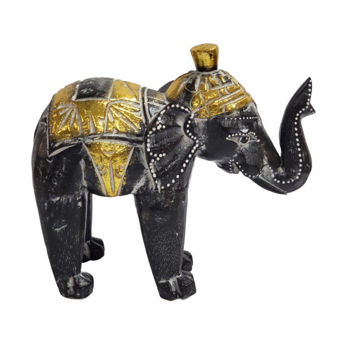 Elefante Madeira Balsa Branco com Preto e Dourado 26cm