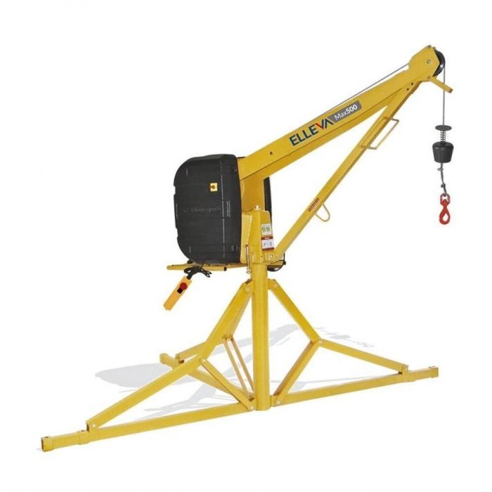 Equipamento que tem como função realizar o transporte vertical de materiais na construção civil. Seus diferenciais são: tripé treliçado, que facilita o transporte e garante maior estabilidade, e lança extensiva que permite aumentar o comprimento do braço de 1,25 m até 2 m. A instalação do equipamento deve ser feita por profissionais treinados. Seu tripé em forma de treliça, possibilita um ganho significativo no volume útil de transporte. E sua lança extensiva garante a movimentação de cargas de maiores volumes, como formas e ferragens para as lajes. Equipamento fabricado a partir da composição de tubos e chapas de aço. Possui pegadores para aproximação da carga, sensor de final de curso no ponto máximo de elevação, sistema de transmissão com freio de segurança, carretel com cunha de travamento, pintura eletrostática de alta resistência a intempéries e ângulo de giro de 360 Modelo Elleva Max 500 EX