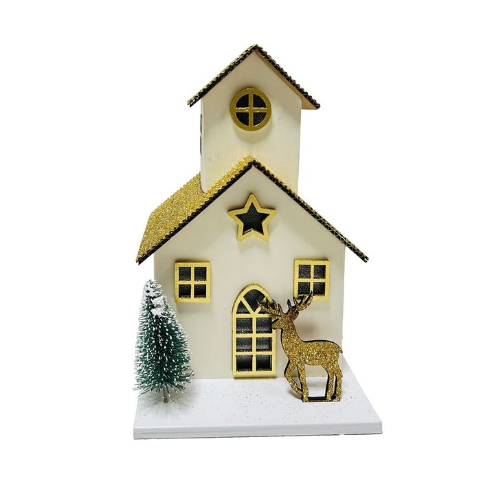Design clássico com acabamento branco, telhado e janelas douradas, evocando a elegância e o charme das festas de fim de ano.