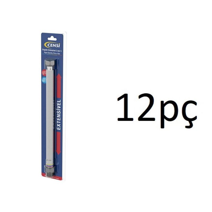 kit c/14 Engates Extensíveis 3 em 1 para Água Quente, Fria e Gás - Rosca Macho 1/2 x Fêmea 1/2 - Compr. 30 cmMarca: Censi Referência: 7571 Embalagem: BlisterAcompanha: 1 vedante. 1 Canopla de Aço Inoxidável.A linha de Engates Extensíveis foi projetada visando o melhor para segurança contra vazamentos e grande resistência a a altas temperaturas, com características acima das exigências estabelecidas pela ABNT (norma 14177). São revestidos com termoplástico antichama e suportam pressão de até 10 kgf/cm².CARACTERÍSTICAS: - Engate extensível com comprimento ajustável. - Comprimento mínimo: 30 cm. - Diâmetro interno: 12,5 mm - Vedante em borracha nitrílica com diâmetro de 19 mm. - Revestimento antichama. - Terminais em latão. - Rosca: Macho 1/2 x Fêmea 1/2. - Indicado para aquecedores a gás, pias e caixas acopladas. - Pressão máxima suportada 15 kgf/cm².