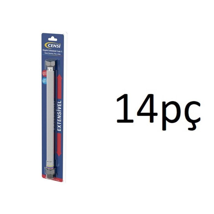 kit c/14 Engates Extensíveis 3 em 1 para Água Quente, Fria e Gás - Rosca Macho 1/2 x Fêmea 1/2 - Compr. 30 cmMarca: Censi Referência: 7571 Embalagem: BlisterAcompanha: 1 vedante. 1 Canopla de Aço Inoxidável.A linha de Engates Extensíveis foi projetada visando o melhor para segurança contra vazamentos e grande resistência a a altas temperaturas, com características acima das exigências estabelecidas pela ABNT (norma 14177). São revestidos com termoplástico antichama e suportam pressão de até 10 kgf/cm².CARACTERÍSTICAS: - Engate extensível com comprimento ajustável. - Comprimento mínimo: 30 cm. - Diâmetro interno: 12,5 mm - Vedante em borracha nitrílica com diâmetro de 19 mm. - Revestimento antichama. - Terminais em latão. - Rosca: Macho 1/2 x Fêmea 1/2. - Indicado para aquecedores a gás, pias e caixas acopladas. - Pressão máxima suportada 15 kgf/cm².