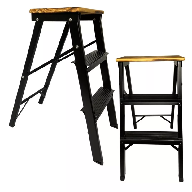 Escada 3 Degraus Retrátil Dobrável Vira Banquinho Doméstico Banqueta Escada Doméstica Banco Banquinho Dobrável 3 Degraus Beleza, conforto, praticidade e segurança! Para realizar consertos rápidos em casa sem abrir mão da segurança, a nossa escada banqueta é ideal para alcançar lugares mais elevados no uso doméstico, assegurando firmeza e conforto no uso. Nossas escadas são confiáveis, com design decorativo, desenvolvidas com peças da melhor qualidade. Dobrável, bonita, leve, fácil de transportar e guardar. Esse modelo possui três degraus estruturados, sendo dois com chapa em alumínio e o tampo de madeira pinus tratada, material leve e de alta resistência, mesmo em áreas litorâneas, contém pés antiderrapantes e travamento lateral para dar mais estabilidade. Nossa escada suporta até 120kg. A Hm Garcia é uma fábrica de dobradiças e acessórios em alumínio, atua no mercado nacional há mais de 30 anos. Prezamos pela qualidade dos nossos produtos, através de uma operação que proporcione colaboração, qualidade e experiências positivas de consumo. Características do Produto: :: Material: Estrutura em alumínio e plataforma em madeira pinus tratada :: Marca: Hm Garcia :: Cor: PRETA :: Características especiais: Escada dobrável, leve, fácil de transportar e guardar. :: Resistente, não enferruja :: Dimensões do produto: - Altura: 62cm (escada aberta) | 79cm (escada fechada) - Profundidade (comprimento): 56cm (escada aberta) | 13cm (escada fechada) - Largura: 35cm - Dimensões do tampo: 23,4cm X 27,5cm - Peso do produto: 2,900kg - Carga máxima: Suporta até 120kg. - Distância entre os degraus: do chão ao primeiro degrau a distância é 23cm, do primeiro ao segundo degrau a distância é 8cm, do segundo degrau a plataforma(tampo) a distância é 21,5cm. :: Disponível em outras cores: branca, preta, amarela, vermelha, cinza fosco, marrom (você pode solicitar a cor da sua preferência, após efetuar a compra). :: Temos outros modelos de banquetas: com três degraus com tampo de polipropileno, escada de dois degraus com tampo de polipropileno ou madeira pinus tratada, não temos escada banqueta de 4 ou mais degraus. (Consulte nossos anúncios).. Produto Exclusivo HM Garcia Perguntas frequentes? - Distância dos degraus? Do chão ao primeiro degrau a distância é 23cm, do primeiro ao segundo degrau a distância é 8cm, do segundo degrau a plataforma(tampo) a distância é 21,5cm - Qual o mais resistente madeira ou polipropileno? Ambos os materiais são resistentes e suportam 120kg. A diferença está no design. - É possível alterar a cor do tampo (patamar)? Não trabalhamos com outras cores de tampo (patamar)