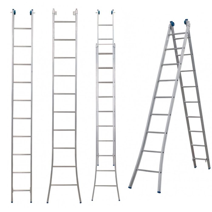 Escada 3 em 1, permitindo a utilização em 3 formas (articulada, separada e estendida). Possui pés e degraus antiderrapantes, com os pés prensados nos perfis de alumínio, evitando que escapem. Conta com degraus ligeiramente maiores e com curvatura para os dois lados, mantendo o coeficiente de segurança e oferecendo mais conforto durante o uso.