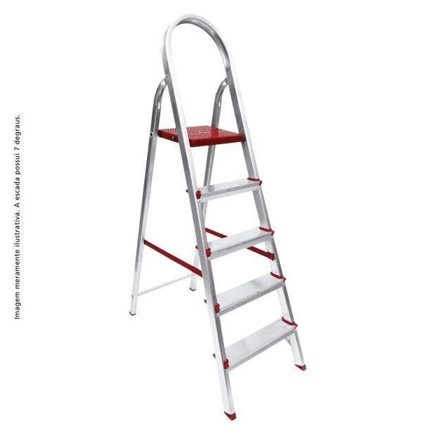 Escada de alumínio suprema; ideal para uso doméstico; patamar em polímero de alta resistência; sapatas antiderrapantes; fita de segurança; capacidade máxima de 120kg; medidas de 3 a 7 degraus; marca worker