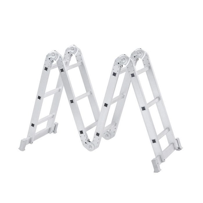 A escada Articulada Multifuncional é reforçada e oferece diversas formas de utilização Para uso profissional e doméstico, possui estrutura super resistente em alumínio, dobradiças em aço com exclusiva trava de segurança e pés emborrachados que aumentam a aderência e não danificam o piso, suporta até 150kg. Com 8 posições de regulagem, oferece estabilidade e segurança total durante seu uso. Por ser totalmente dobrável, ao fechá-la seu volume diminui ocupando pouquíssimo espaço, facilitando seu transporte e armazenamento em qualquer lugar. Leve e resistente, é confeccionada em alumínio de acordo a norma europeia EM-131. - Especificações Técnicas: :: Capacidade: 150kg:: Cor: Alumínio:: Material: Alumínio:: Degraus: 12:: Estendida: 340cm:: Fechada: 94cm:: Pintor: 167cm:: Andaime: 1m:: Peso: 10,5kg