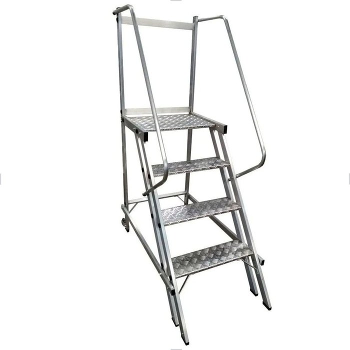 Uma plataforma de trabalho que reúne a segurança dos degraus com 170 mm de pisada e com a plataforma de 600 mm de largura x 450 mm de profundidade revestimento dos degraus fabricados em chapa xadrez para maior resistência podendo suportar até 250 kg, possui duas rodas na traseira para facilitar sua movimentação, guarda corpo na plataforma com 0,70 m de altura e corrimãos nos dois lados e fechamento no fundo da plataforma.