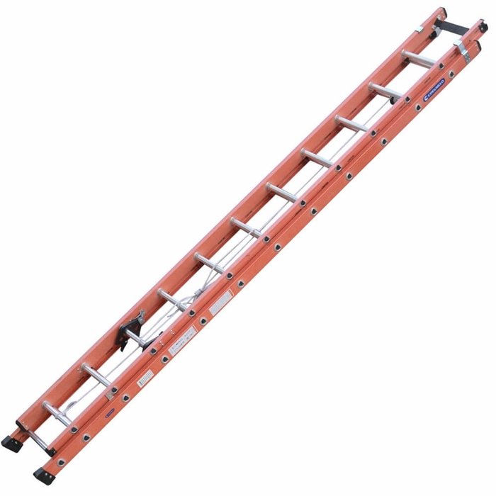 Modelo Extensível Vazado, com perfis "U" em fibra de vidro e degraus em alumínio. É o modelo mais utilizado por profissionais de empresas de telecomunicações.