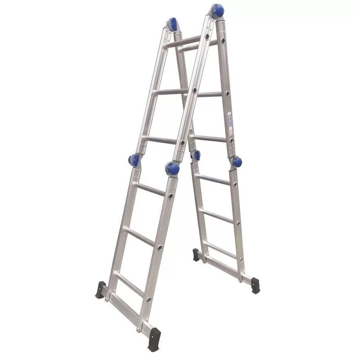 Escada multiuso feita em alumínio de excelente qualidade, compacta, leve para manuseio, super-resistente até 150 kg, não enferruja, com pés de borracha para não deslizar e dar mais estabilidade, dobradiças em aço, travas de segurança.