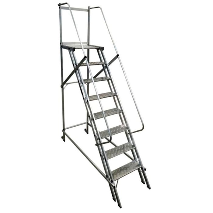 | Mais informações | Guarda corpo com 0,70m de altura. Degraus e plataforma: Chapa Xadrez (tipo piso de ônibus) com estrias antiderrapantes. Capacidade máxima de carga, usuário e material: 250Kg Plataforma com dimensões de 0,60 x 0,40m - TOTAL - Largura e Profundidade (respectivamente) Profundidade dos degraus: 0,16m Distância entre os degraus de: 0,25m Corrimãos: 1 de cada lado e Fechamento Frontal - O que chamamos de 2CF. Rodas: 2 rodas de 3 polegadas para facilitar a movimentação da escada. DEGRAUS e PLATAFORMA: 7 DEGRAUS + A PLATAFORMA – Totalizando: 8. |