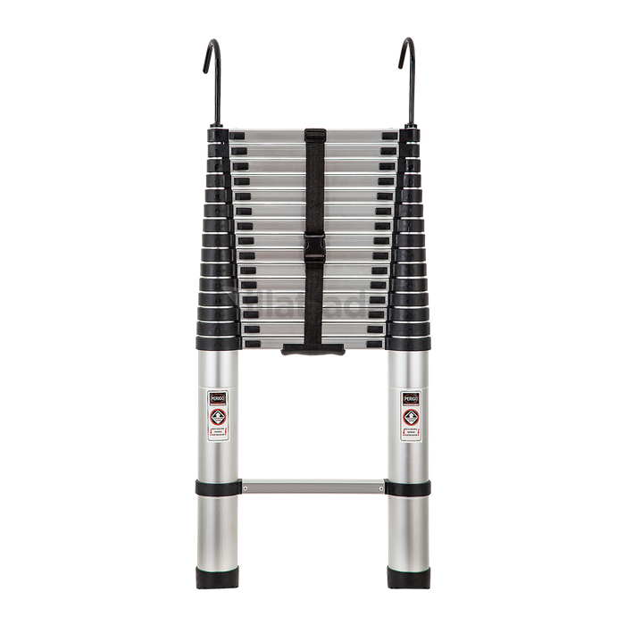Escada Telescópica de apoio confeccionada no mais nobre alumínio aeronáutico, não enferruja. Com 16 degraus, alcança até 4,70 metros. Altamente resistente com travas em aço, suporta até 150 kg.