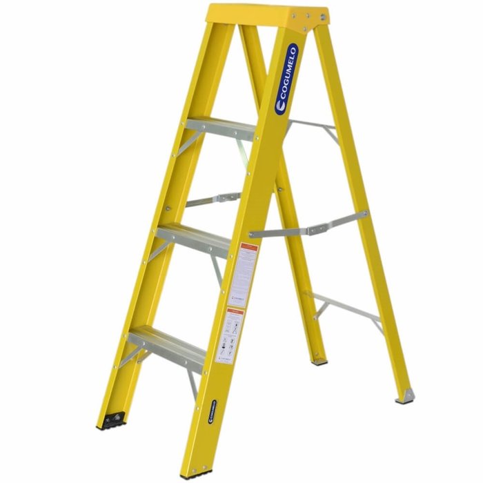 Modelo Tesoura, indicada para uso em ambientes residenciais, com topo diferenciado para apoio de acessórios e ferramentas. Perfis em fibra de vidro e degraus em alumínio. O Modelo possui dispositivo de segurança que impede que o usuário prenda o dedo ao abrir/fechar a escada. Todos os degraus são reforçados com mão francesa, o que proporciona maior segurança.