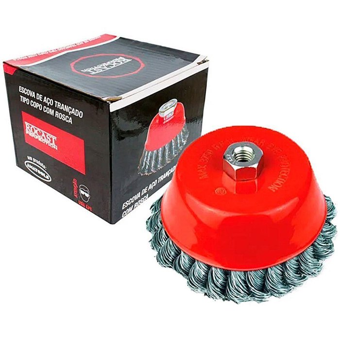 Escova De Aço Trançado Tipo Copo Com Rosca - Med. 100 (mm) Escova de Aço Trançado Tipo Copo Com Rosca Circular utilizado para limpar duramente superfícies de metal de ferrugem e sujeira e também para limpar junteiras de soldagem.