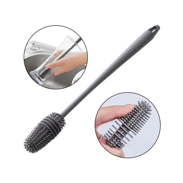 Esta escova, feita com cerdas de silicone, com cabo anatômico e esfregador, permitirá que você alcance todas as áreas do recipiente a ser limpo (garrafas, copos, jarras, mamadeiras, etc), realizando a higienização de forma completa e sem danificar a superfície do item.