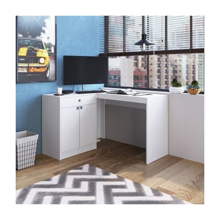 Escrivaninha em L 1 Gaveta 2 Portas Placa e Ponto Branca