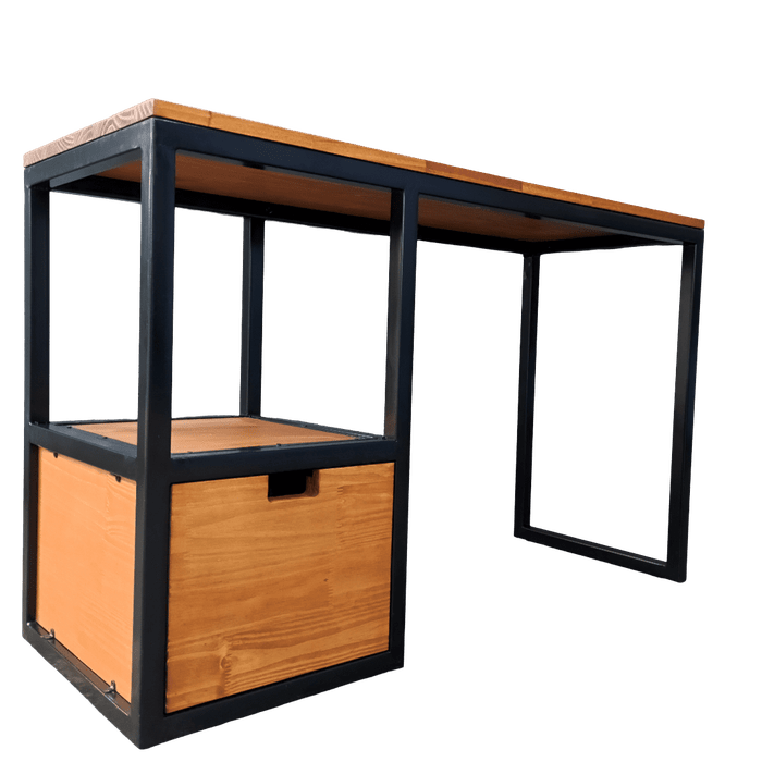 Tampo superior robusto, confeccionado em madeira pinus de alta qualidade, proporcionando durabilidade e charme. À esquerda, um nicho vazado e uma gaveta, esta última integrada de maneira única às barras de ferro, conferindo um autêntico estilo industrial à peça.