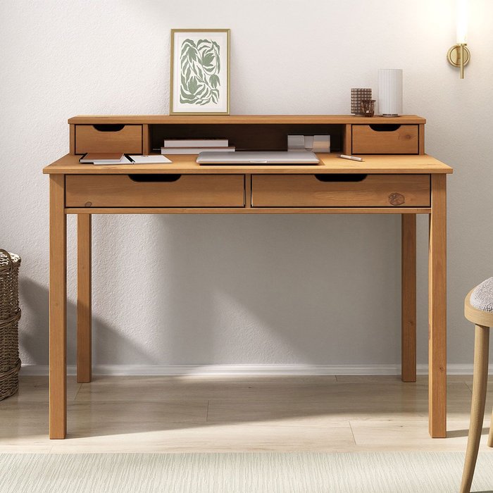 A Escrivaninha Organizadora Compacta de Madeira Maciça Raul no módulo superior possui dois nichos abertos e duas gavetas menores, perfeitas para manter itens essenciais sempre à mão. Além disso, a estrutura com fundo em MDF permite que a peça seja posicionada encostada na parede, garantindo praticidade e otimização do espaço.