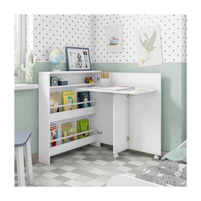 A Escrivaninha Infantil Branca Estrela foi fabricada pensando no seu filho! Ela possui sistema anti-tombamento, impossibilitando que a Escrivaninha tombe sobre ele enquanto estuda ou desenha. Possui 3 prateleiras para armazenar livros e brinquedos, suas rodinhas facilitam sua abertura sem riscar o piso, sendo 1 rodinha com trava e outra sem. Seu design que abre e fecha, permite proteger os itens armazenados. Escrivaninha ideal para quartos pequenos, salas e ambientes onde você precise poupar espaço.