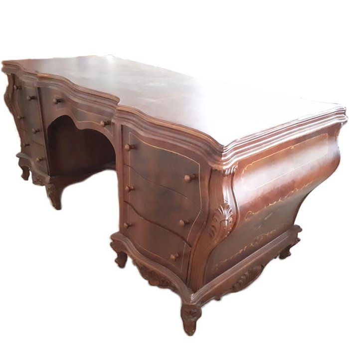 O estilo clássico desta belíssima escrivaninha vai levar requinte e beleza para a decoração do seu ambiente, produzido em madeira nobre com riqueza de detalhes marchetado com marquiterrie e verniz. Possui ornamentos decorativos em metal.Somos especializados em decoração de ambientes, oferecemos produtos únicos, em pequenas quantidades trazendo a exclusividade e o charme que a sua casa merece. Produzido em madeira de excelente qualidade . Medidas: 91x180x91 cm Para limpar utilize apenas um pano macio seco, umedecido com água ou com lustra-móveis. Não utilize produtos abrasivos.