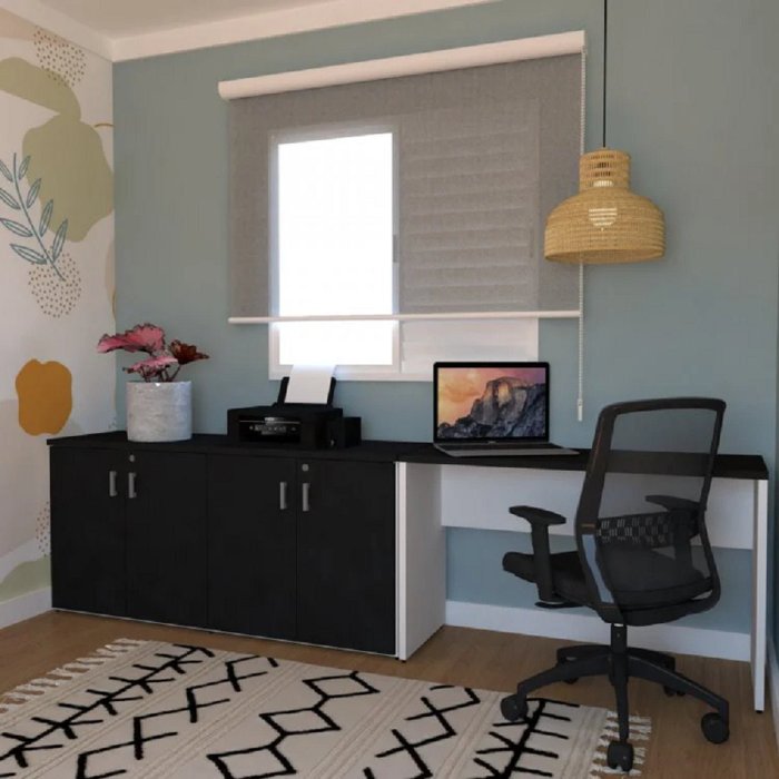 Escrivaninha Mesa Escritório 100cmx47cm com Armário Baixo 4 Portas 25mm Branco/Preto
