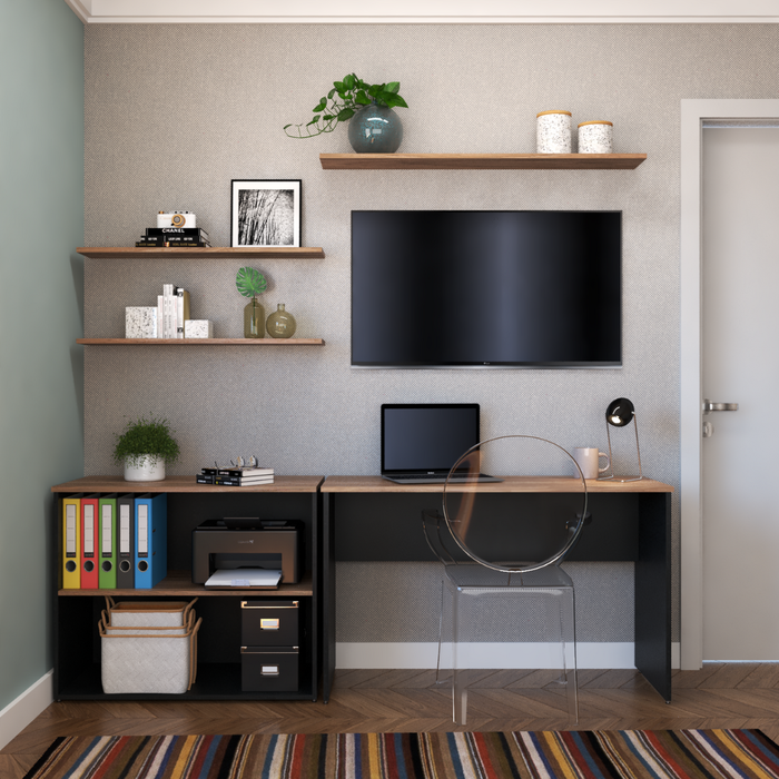 | Informações Complementares (Novo) | Acompanha 1 estante baixa lateral (Largura: 90cm, Profundidade: 47cm e Altura: 75cm) e 3 prateleiras para fixar na parede. |