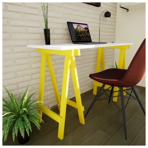 Escrivaninha Prática MDP Branco e Cavaletes Amarelo Fabricada com MDP 15mm Branco com reforço nas bordas chegando a 30mm de espessura na medida de 60cm de profundidade x 1,20m de largura, com par de cavaletes prático dobrável em madeira maciça na cor Amarelo Estrada, dando praticidade e usabilidade ao móvel. Utiliza-se em vários lugares e necessidades funcionando como, bancada de serviço, jardinagem, Escrivaninha para escritório, excelente para seu trabalho home office. Organização, praticidade e decoração em um só produto, se adequando a qualquer ambiente com usabilidade, o seu home office prático.